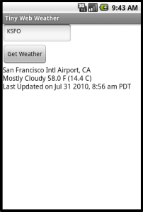 I just scanned the bar code on my android 2.2 phone and the apk downloaded just fine. I then touched the download link and the package installed. You can also run this by downloaded the source (“Customize It”) from above (http://tinywebweather.appspot.com/static/TinyWebWeather.zip) and importing that into app inventor to test on an emulator or phone.